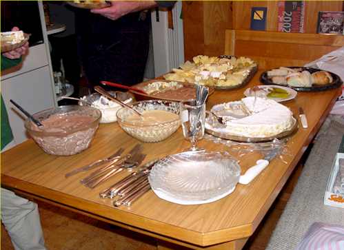 auf dem Küchentisch ist das Dessert- und Käsebuffet bereit
