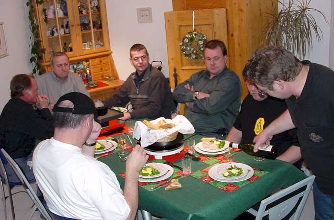 Etwas später: Die Vorspeise ist serviert und der Obmann schenkt den Weissen ein. Es darf getafelt werden