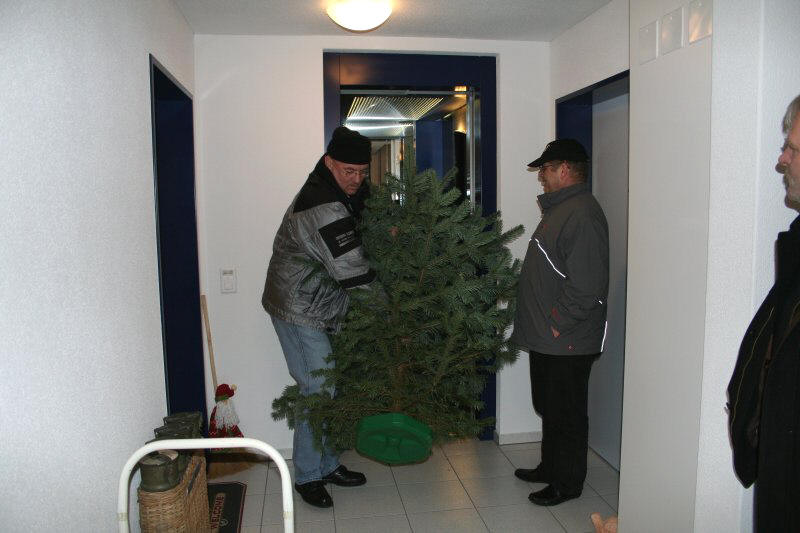 seinen Christbaum mit dem Lift in die Wohnung bringt