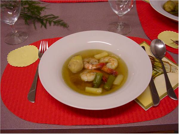 Spargelsuppe mit Artischocken und Meeresfrüchten