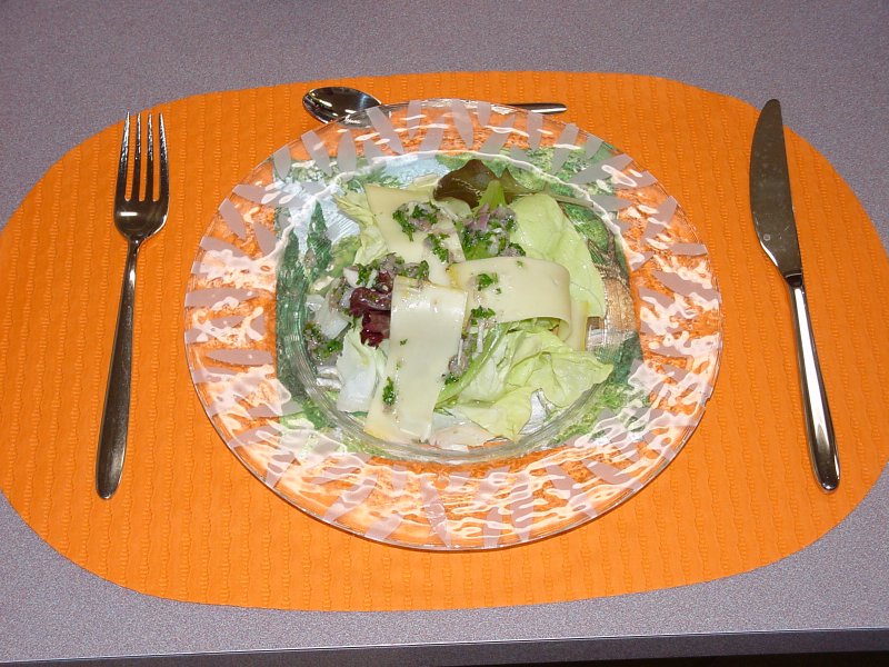 Der Frühlingssalat mit marinierten Tilsiterscheiben ist bereit