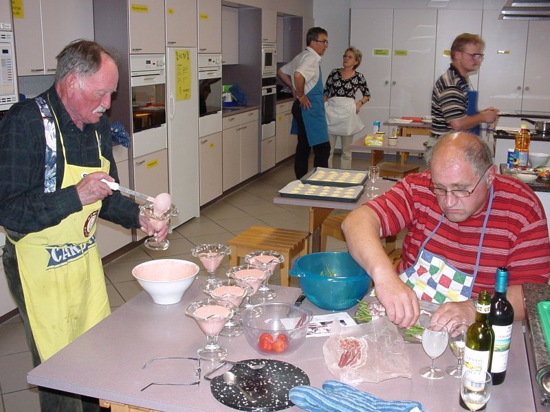 Walt Blättler füllt das Erdbeer-Mousse in die Gläser ab, derweil Hansruedi Senn die Bohnenbündeli kreiert