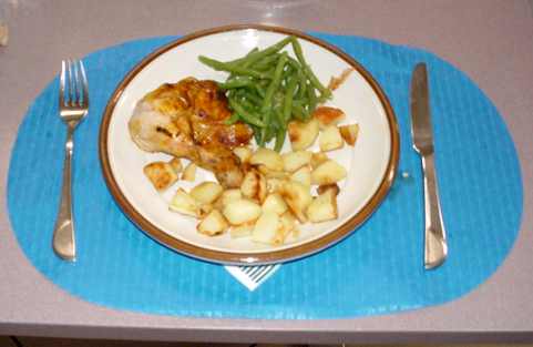 Grillhänchen mit Calvadossauce, Bratkartoffeln, Gedämpfte Bohnen