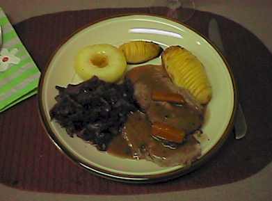 Sauerbraten, Rotkraut mit Quitten und Bratkartoffeln